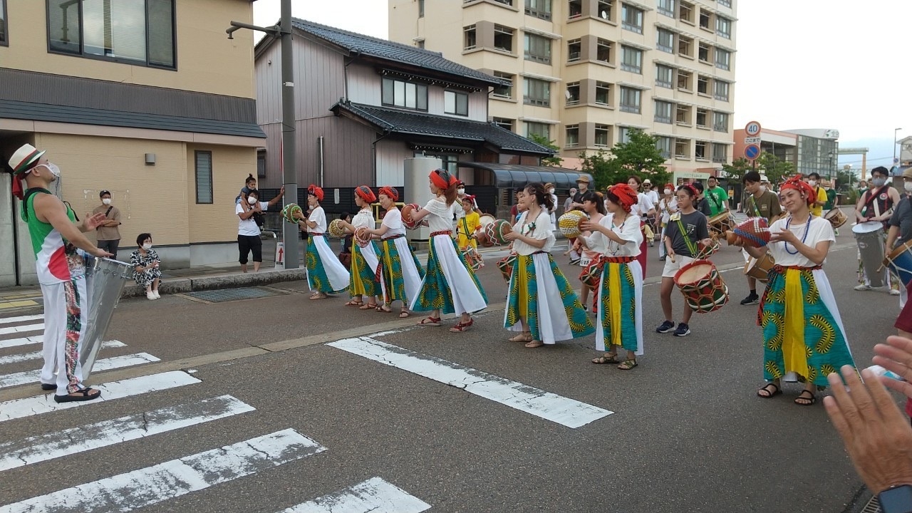 昨年は、福野中学校前から駅前通りを演奏し、ヘリオスへと行進しました。