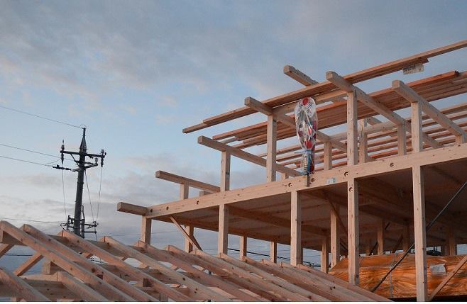 H様上棟式 2016.01.22 つい先週まで今年は雪降らないねーなんて話していたのに今はスコップ持って汗だくの毎日です(;一_一) この雪が降るまさに前日、H様邸の上棟を行いました。 きっと雪がH様の上棟が終わるのを待っていてくれたのですね。 H様、上棟おめでとうございます!! 朝に「一日中見ていたい。仕事休めばよかった~」の言葉が私たちにとって、とてもうれしいお言葉でしたよ(*^。^*)