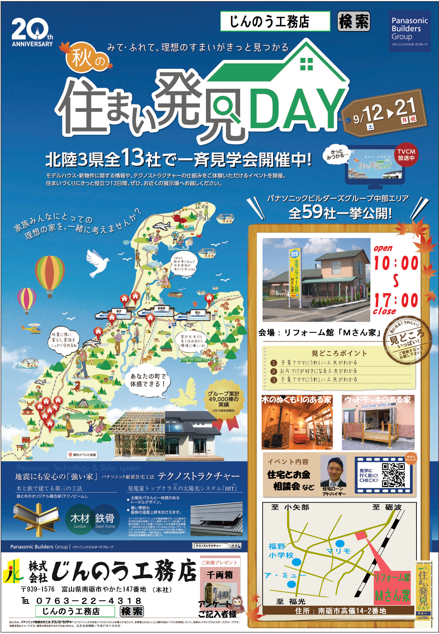 秋の住まい発見DAY 2015.09.10 秋の住まい発見DAY みて・ふれて、理想の住まいがきっと見つかる 期間中10:00~17:00 場所:南砺市高儀14-2(神能工務店リフォーム館「Mさん家」) 住宅工法:テクノストラクチャー工法