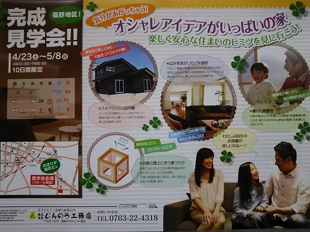 住宅完成見学会 4/23〜5/8 2021.07.01 住宅完成見学会 23日より見学会として一般公開いたします 日時 4月23日(土曜)よりオープン 5月8日まで見学可能です。 10時~17時 (月・火・水曜日定休) 開催場所 苗島地内 23日折り込みチラシより↓