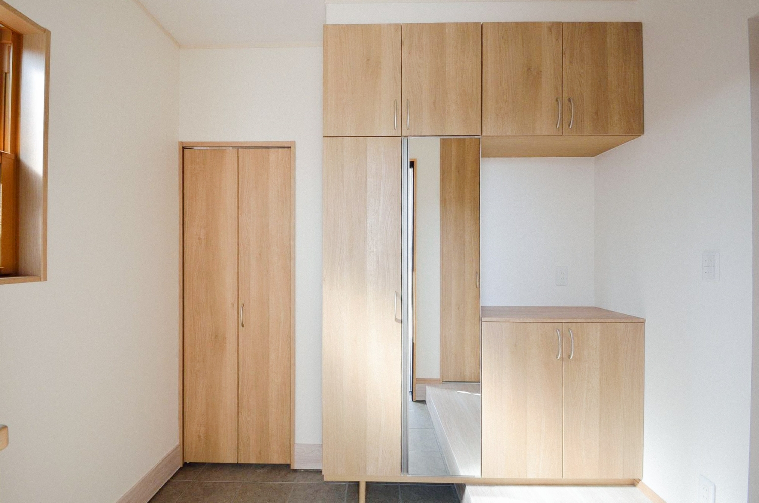 扉で仕切ることで、急な来客の際には目に届かないところに靴などを片付けることができます。雪国固有の除雪道具や除湿機のためのコンセントも配置して湿度対策もばっちりです。