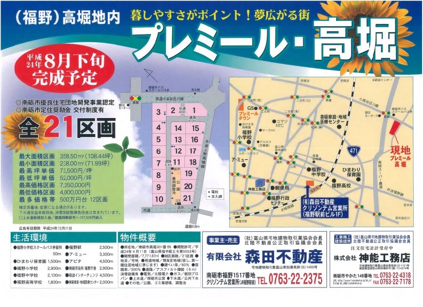土地情報 〜プレミール・高堀(福野地区)〜 2012.09.04 7月24日の広告より掲載してます。 事業主・売主 有限会社 森田不動産 工事施工建築提携 株式会社 神能工務店 当社で南砺市高堀(福野)で21区画の造成工事をおこなっています。 詳しいお問い合わせは ↓ または当社までどうぞ~ 有限会社 森田不動産 南砺市福野1517番地 グリゾンテム営業所(JR福野駅前) 電話 0763-22-2375